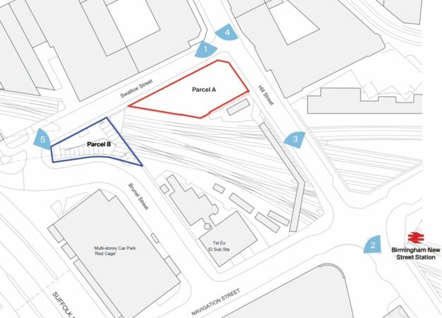 Currently used for 29 pay and display surface parking spots, the land is bordered by Swallow Street, Hill Street and a railway cutting into Birmingham New Street station.